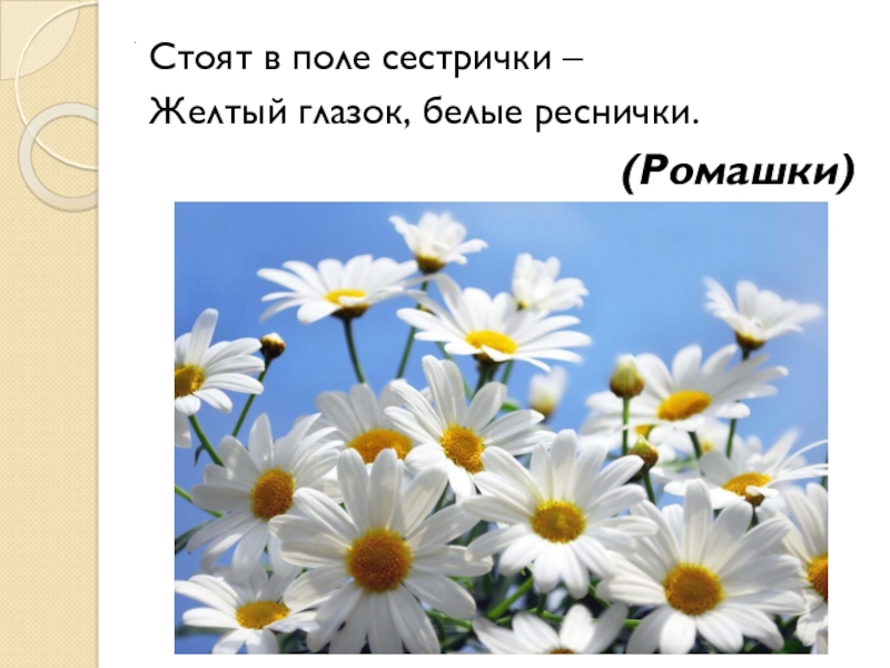 .Стоят в поле сестрички – Желтый глазок, белые реснички.(Ромашки)