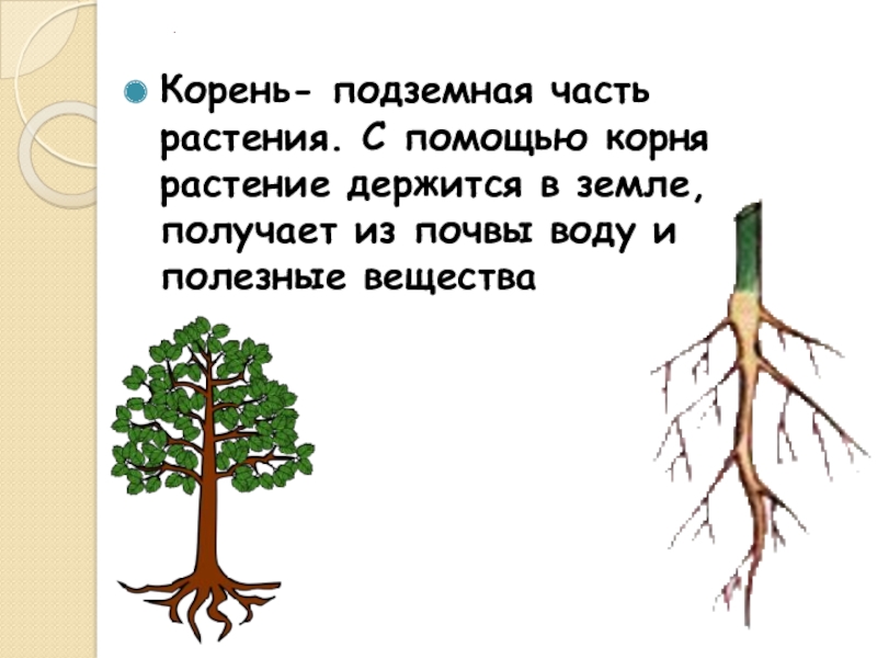 .Корень- подземная часть растения. С помощью корня растение держится в земле, получает из почвы воду и полезные