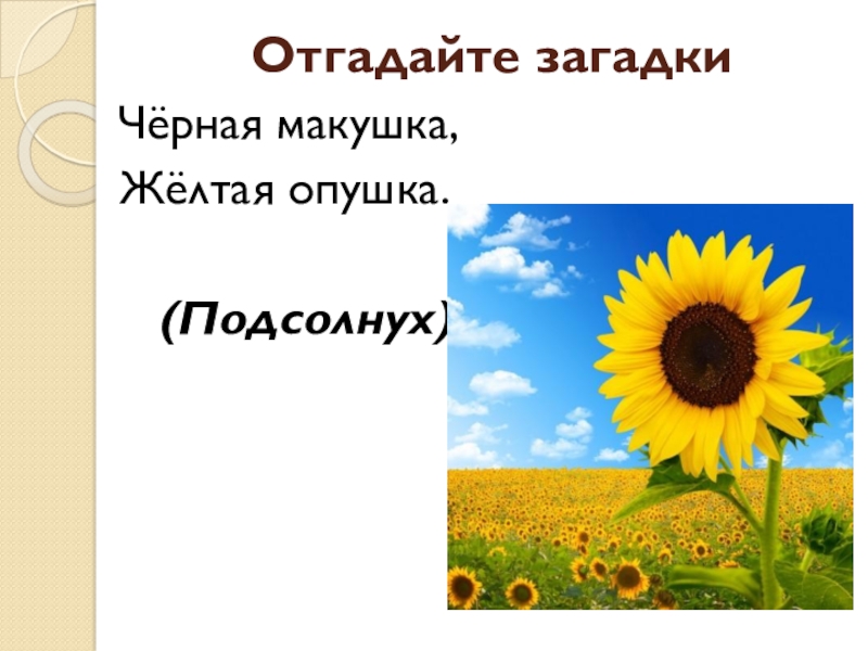 Отгадайте загадкиЧёрная макушка, Жёлтая опушка. (Подсолнух)