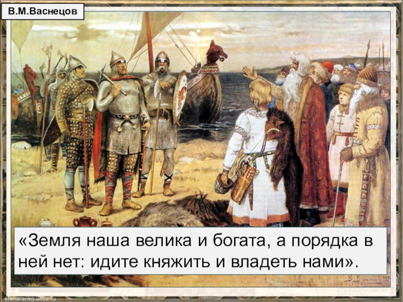 Вот старики славянские, видя счастье варягов и желая такого же своей родине, уговорили всех славян отправить послов к этому храброму и предприимчивому народу – просить у него князей управлять ими. Послы сказали варяжским князьям: «Земля наша велика и богата, а порядка в ней нет: идите княжить и владеть нами».