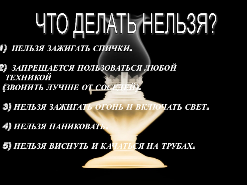 3) НЕЛЬЗЯ ЗАЖИГАТЬ ОГОНЬ И ВКЛЮЧАТЬ СВЕТ.