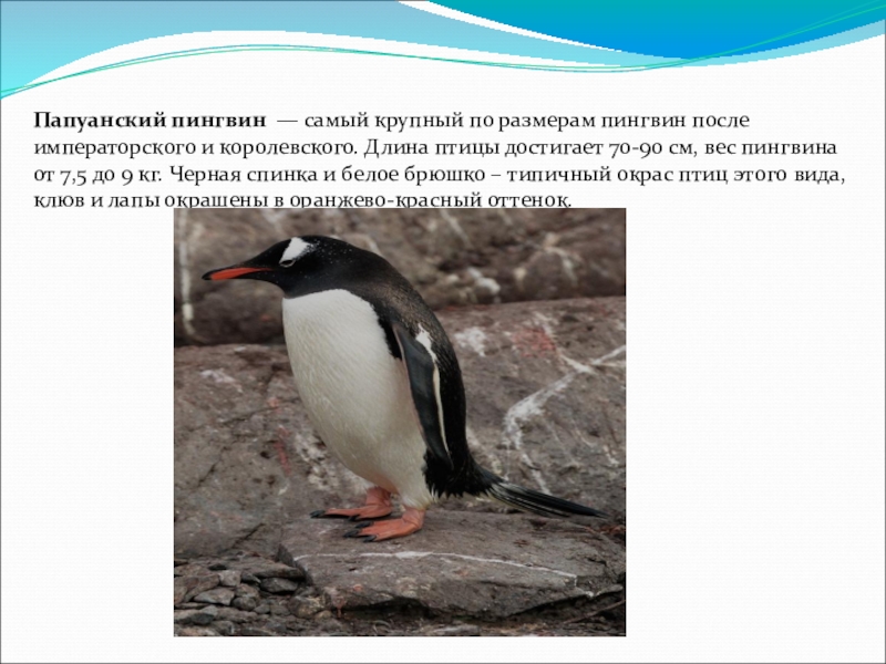 Слайд 14Папуанский пингвин — самый крупный по размерам пингвин после императорского и