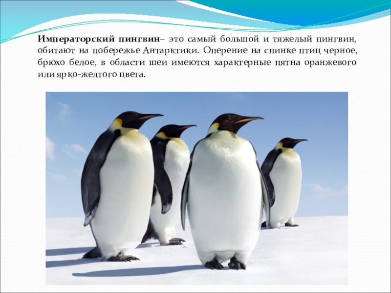 Слайд 9Императорский пингвин– это самый большой и тяжелый пингвин, обитают на побережье