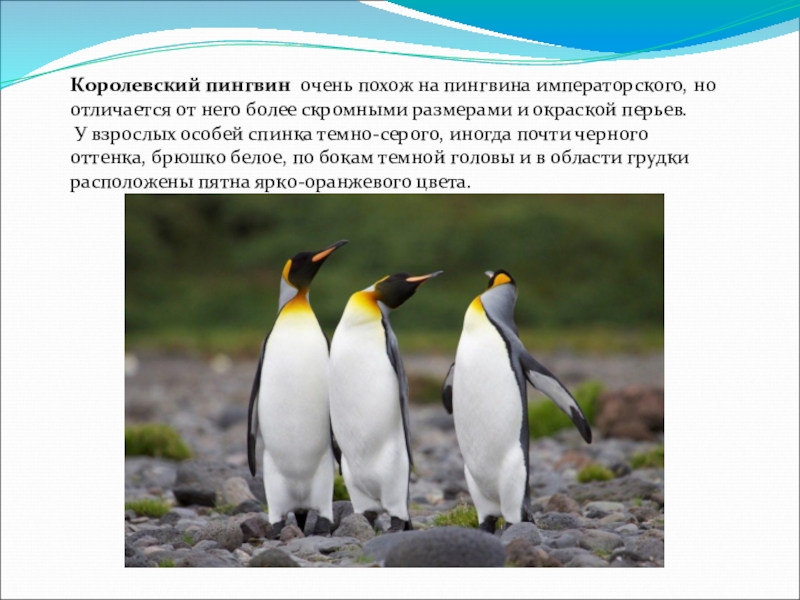 Слайд 10Королевский пингвин очень похож на пингвина императорского, но отличается от него