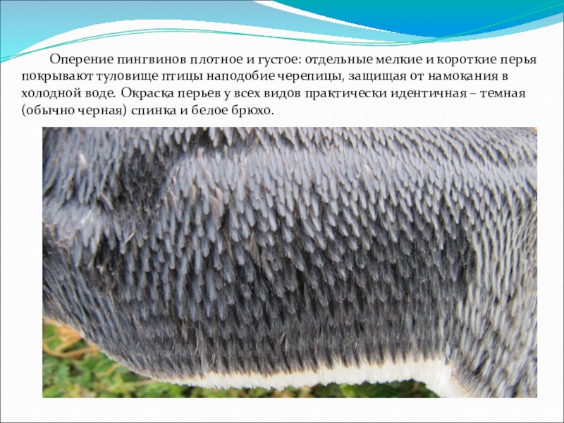 Слайд 6 Оперение пингвинов плотное и густое: отдельные мелкие