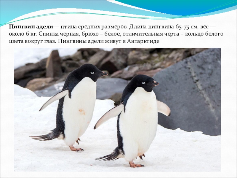 Слайд 11Пингвин адели— птица средних размеров. Длина пингвина 65-75 см, вес —