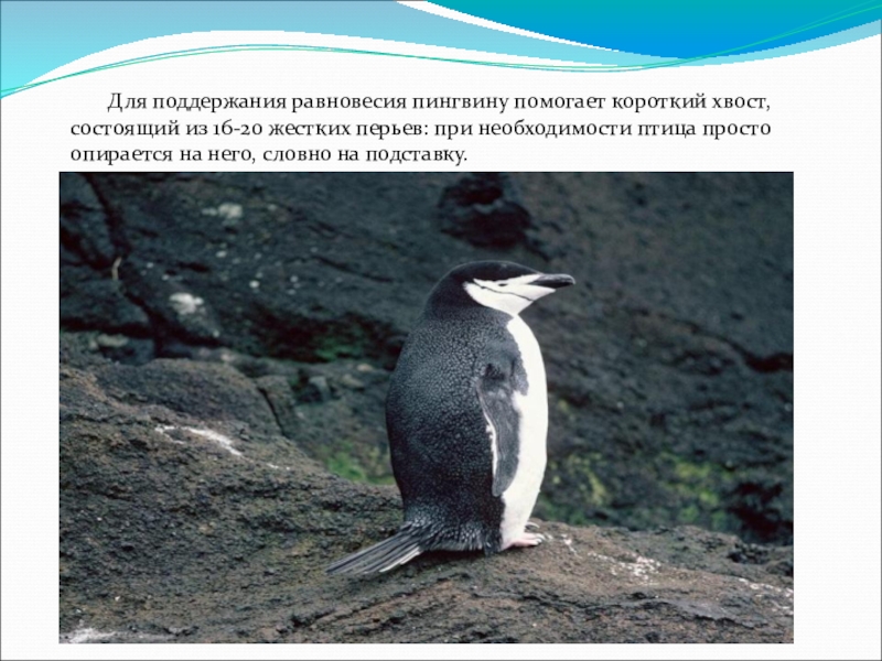 Слайд 5 Для поддержания равновесия пингвину помогает короткий хвост,