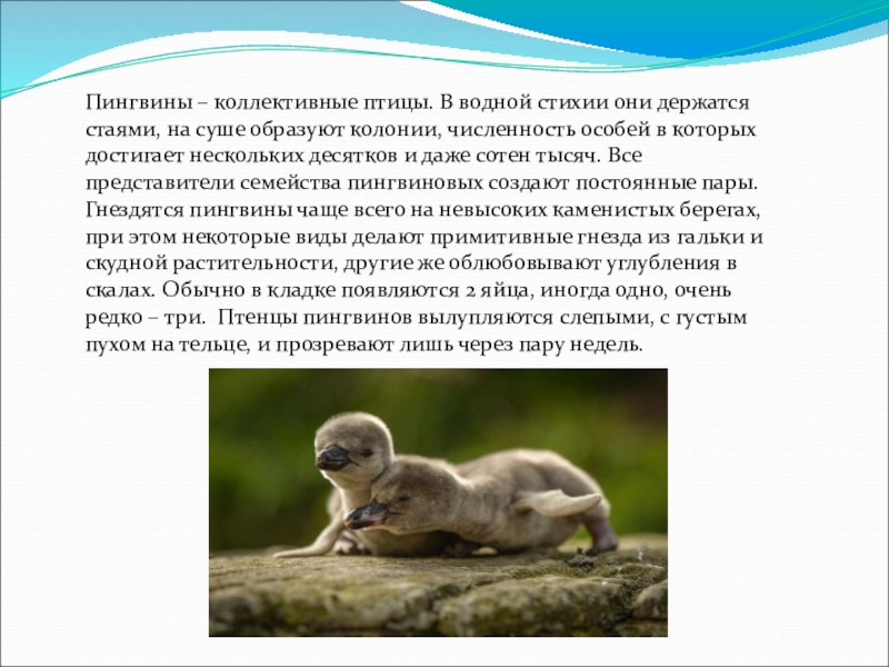 суше образуют колонии, численность особей в которых достигает нескольких десятков и даже сотен тысяч. Все представители семейства пингвиновых создают постоянные пары. Гнездятся пингвины чаще всего на невысоких каменистых берегах, при этом некоторые виды делают примитивные гнезда из гальки и скудной растительности, другие же облюбовывают углубления в скалах. Обычно в кладке появляются 2 яйца, иногда одно, очень редко – три. Птенцы пингвинов вылупляются слепыми, с густым пухом на тельце, и прозревают лишь через пару недель.