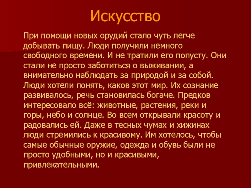 получили немного свободного времени. И не тратили его попусту. Они стали не просто заботиться о выживании, а внимательно наблюдать за природой и за собой. Люди хотели понять, каков этот мир. Их сознание развивалось, речь становилась богаче. Предков интересовало всё: животные, растения, реки и горы, небо и солнце. Во всем открывали красоту и радовались ей. Даже в тесных чумах и хижинах люди стремились к красивому. Им хотелось, чтобы самые обычные оружие, одежда и обувь были не просто удобными, но и красивыми, привлекательными.
