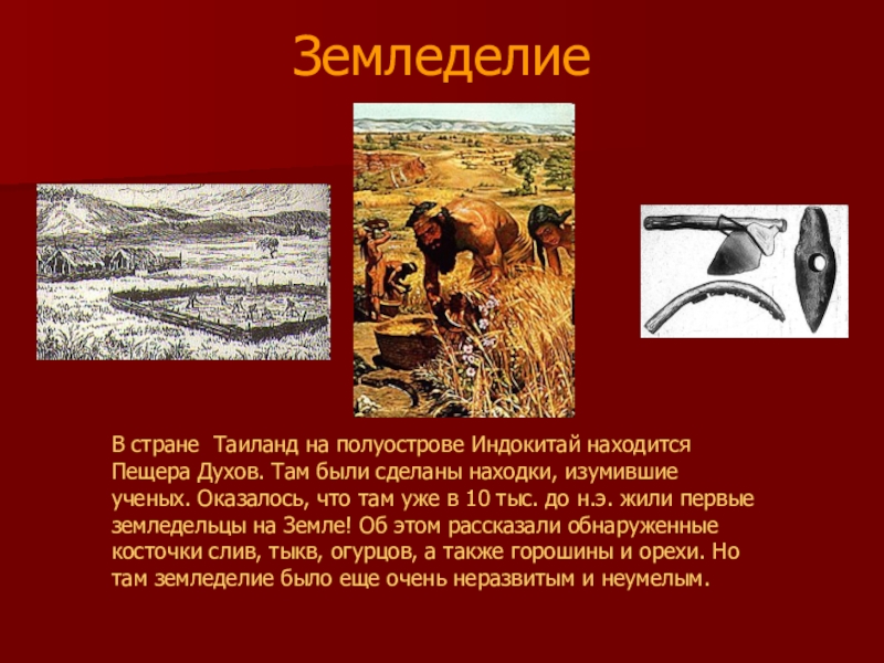 были сделаны находки, изумившие ученых. Оказалось, что там уже в 10 тыс. до н.э. жили первые земледельцы на Земле! Об этом рассказали обнаруженные косточки слив, тыкв, огурцов, а также горошины и орехи. Но там земледелие было еще очень неразвитым и неумелым.