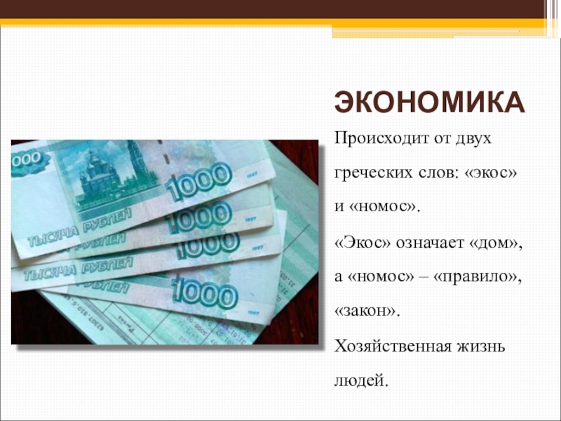 ЭКОНОМИКАПроисходит от двух греческих слов: «экос» и «номос». «Экос» означает «дом», а «номос» – «правило», «закон».Хозяйственная жизнь