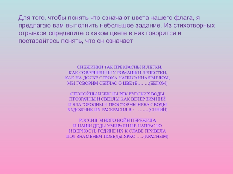Для того, чтобы понять что означают цвета нашего флага, я предлагаю вам выполнить небольшое задание. Из стихотворных отрывков определите о каком цвете в них говорится и постарайтесь понять, что он означает.