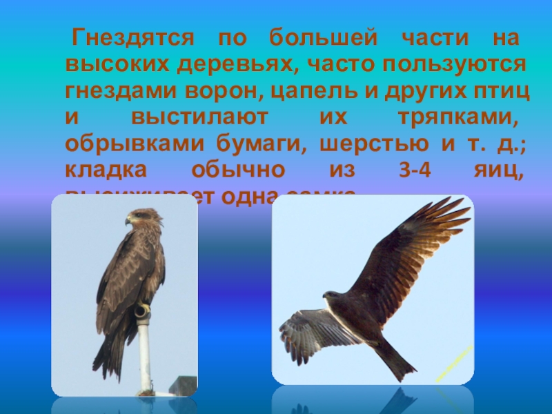Слайд 6 Гнездятся по большей части на высоких деревьях, часто пользуются гнездами ворон,