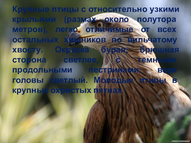 Слайд 8Крупные птицы с относительно узкими крыльями (размах около полутора метров), легко