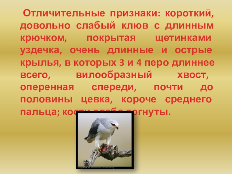 Слайд 2 Отличительные признаки: короткий, довольно слабый клюв с длинным крючком, покрытая щетинками