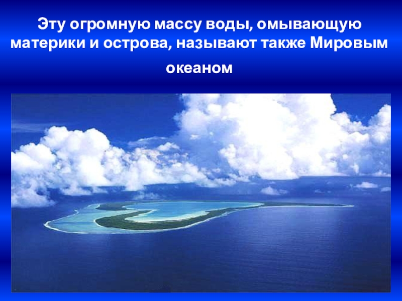 Слайд 4Эту огромную массу воды, омывающую материки и острова, называют также Мировым