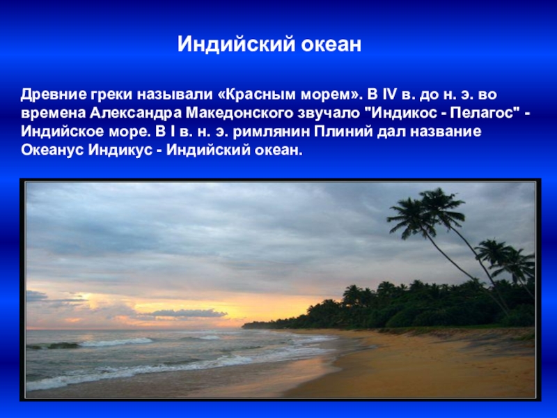 э. во времена Александра Македонского звучало "Индикос - Пелагос" - Индийское море. В I в. н. э. римлянин Плиний дал название Океанус Индикус - Индийский океан.
