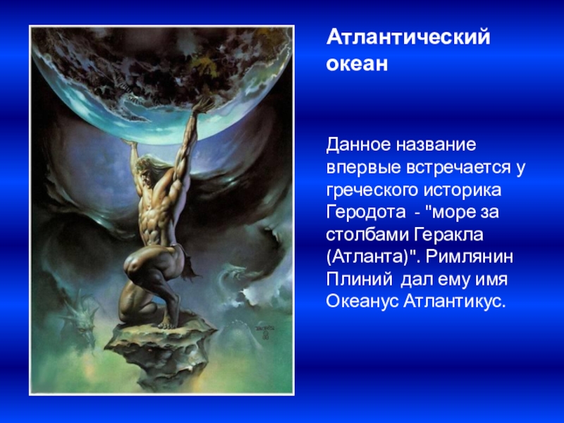 Данное название впервые встречается у греческого историка Геродота - "море за столбами Геракла (Атланта)". Римлянин Плиний дал ему имя Океанус Атлантикус.