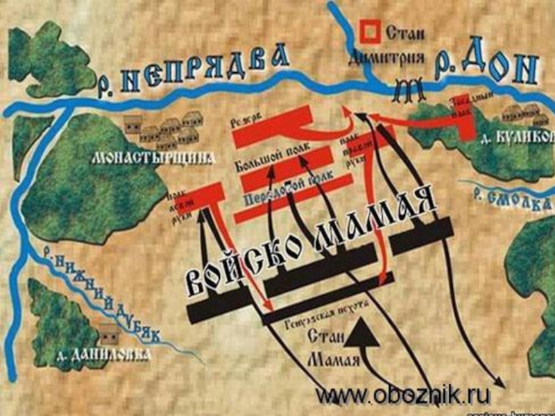 В ночь с 7 на 8 августа, перейдя реку Дон с левого на правый берег по наплывным мостам из бревен и уничтожив переправу, отрезая себе путь к отступлению русские вышли к Куликову полю.