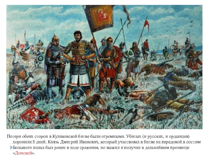Дмитрий Донской.Потери обеих сторон в Куликовской битве были огромными. Убитых (и русских, и ордынцев) хоронили 8 дней.