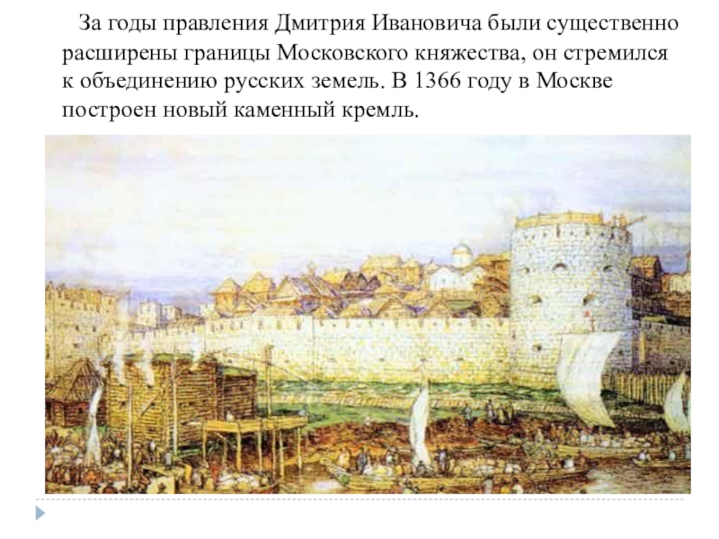 границы Московского княжества, он стремился к объединению русских земель. В 1366 году в Москве построен новый каменный кремль.