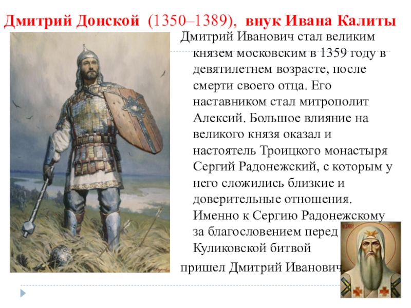 Дмитрий Донской (1350–1389), внук Ивана Калиты Дмитрий Иванович стал великим князем московским в 1359 году в девятилетнем