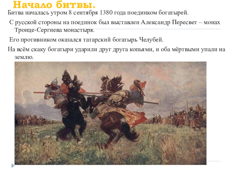 Начало битвы.Битва началась утром 8 сентября 1380 года поединком богатырей. С русской стороны на поединок был выставлен