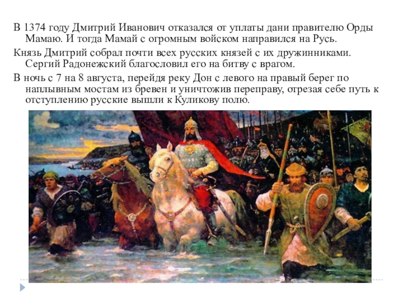 В 1374 году Дмитрий Иванович отказался от уплаты дани правителю Орды