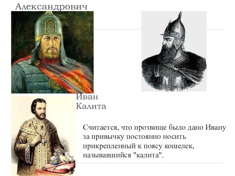 Александр Невский Даниил Александрович Иван КалитаСчитается, что прозвище было дано Ивану за привычку постоянно носить прикрепленный к поясу кошелек, называвшийся "калита".