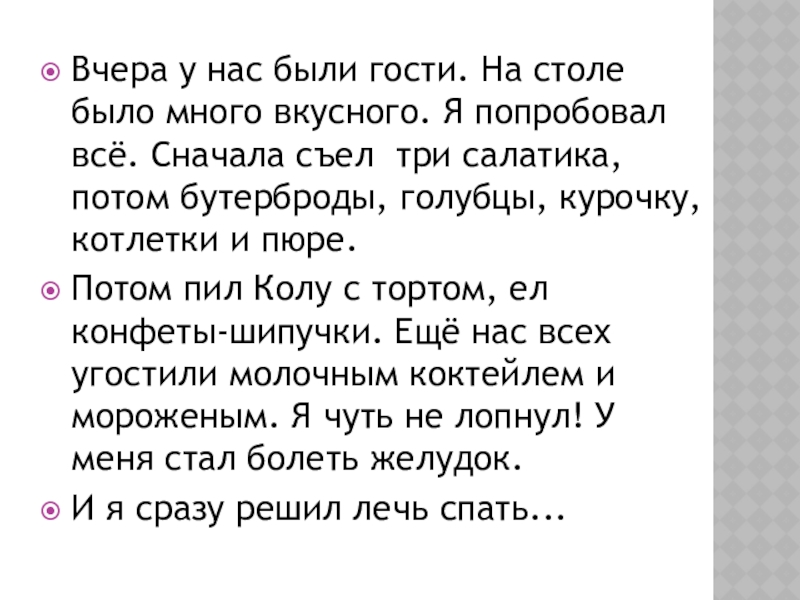 Вчера у нас были гости. На столе было много вкусного. Я попробовал всё. Сначала съел три салатика,