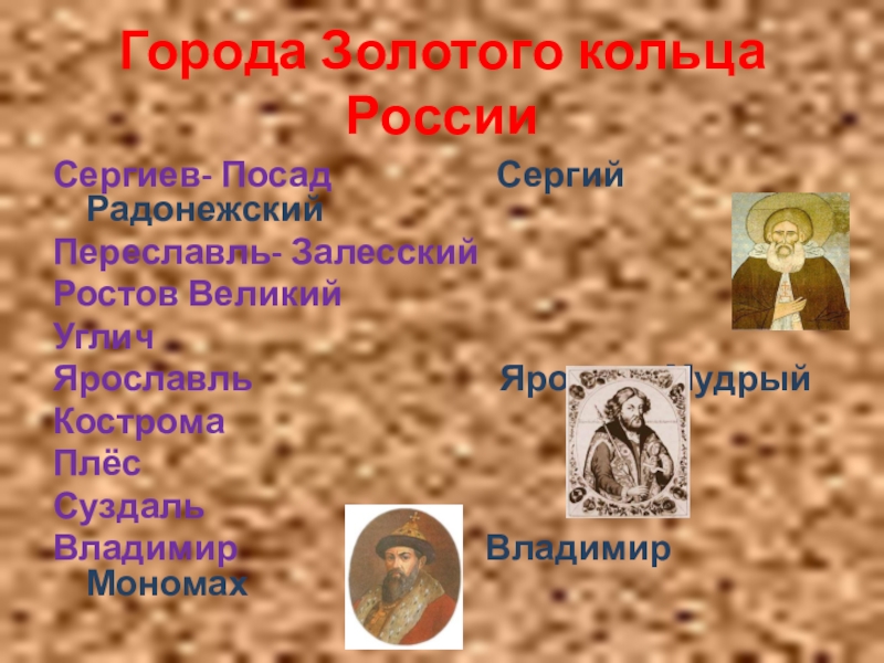 Города Золотого кольца РоссииСергиев- Посад          Сергий РадонежскийПереславль- ЗалесскийРостов