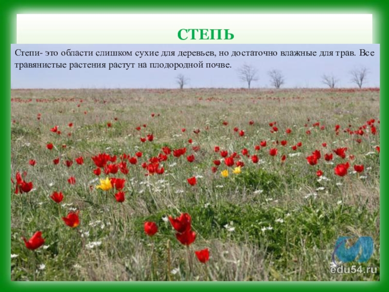 СТЕПЬСтепи- это области слишком сухие для деревьев, но достаточно влажные для трав. Все травянистые растения растут