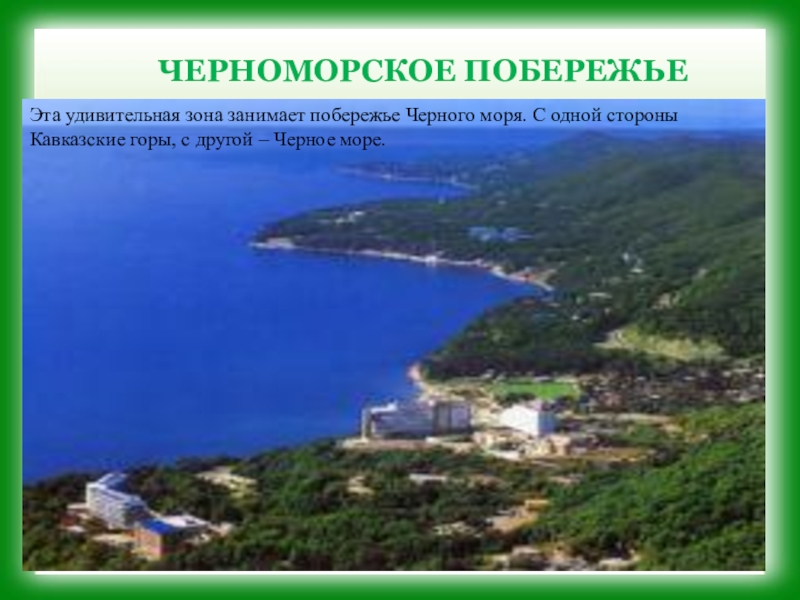 ЧЕРНОМОРСКОЕ ПОБЕРЕЖЬЕЭта удивительная зона занимает побережье Черного моря. С одной стороны Кавказские горы, с другой –