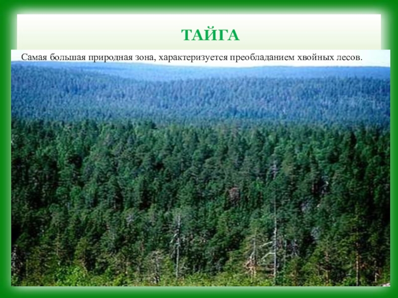 ТАЙГАСамая большая природная зона, характеризуется преобладанием хвойных лесов.