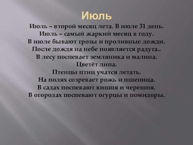Июль – второй месяц лета. В июле 31 день.