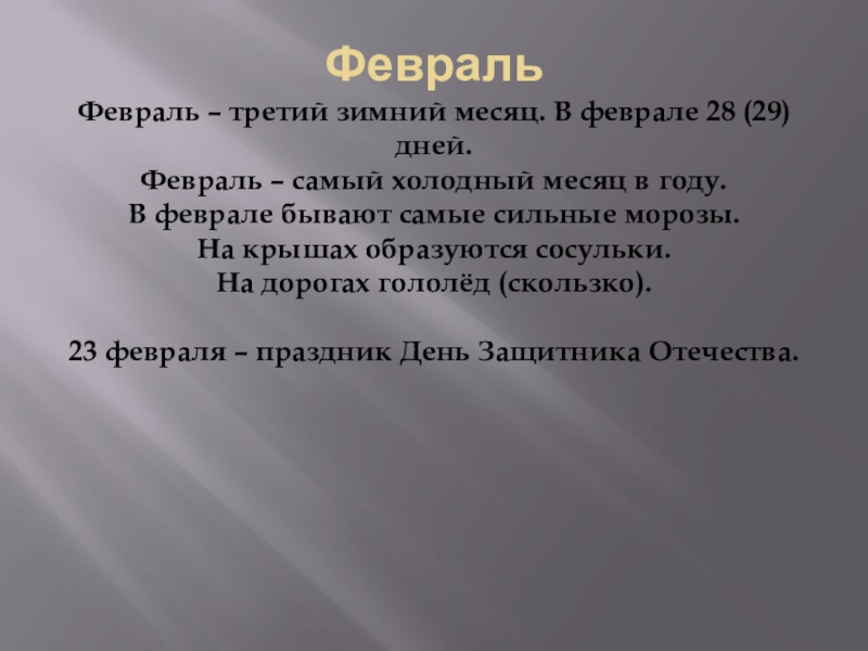 Февраль – третий зимний месяц. В феврале 28 (29) дней.