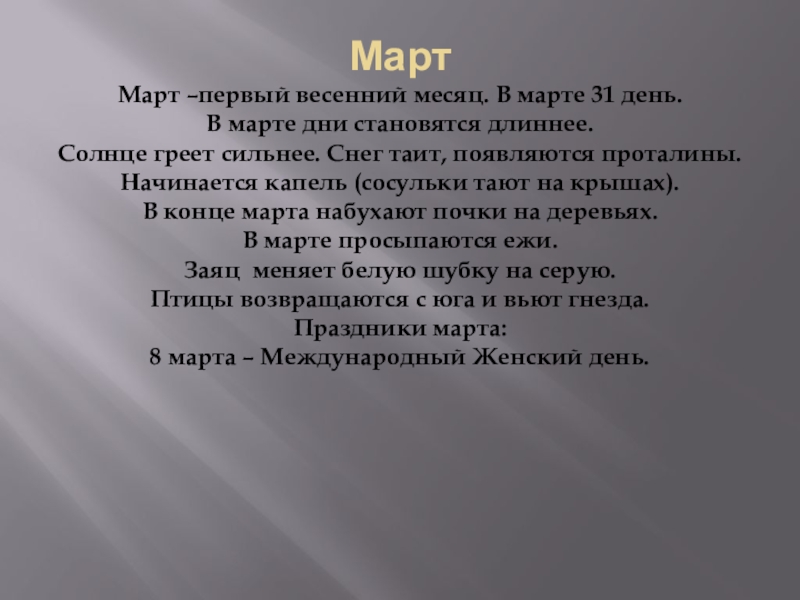Март –первый весенний месяц. В марте 31 день.