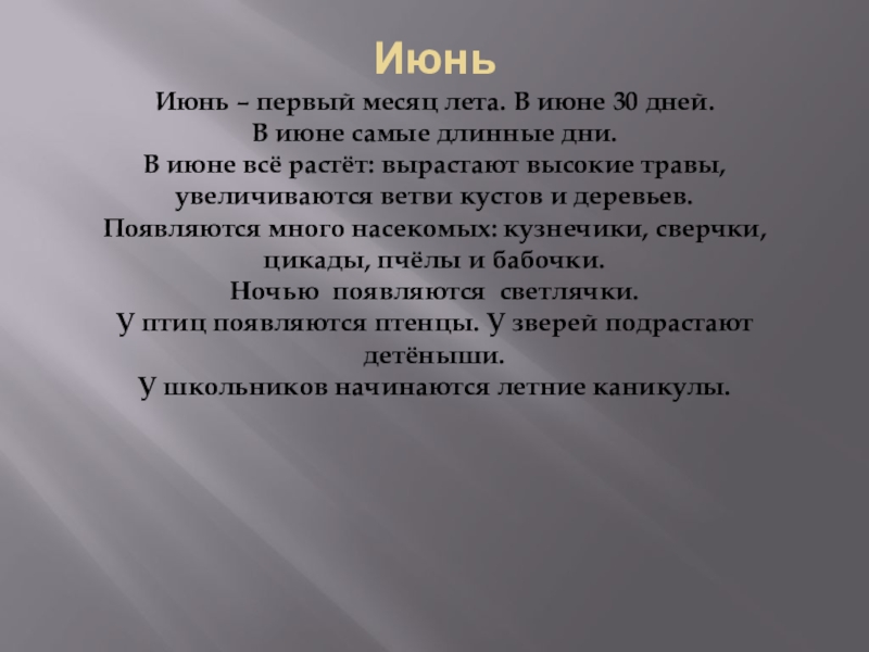 Июнь – первый месяц лета. В июне 30 дней.