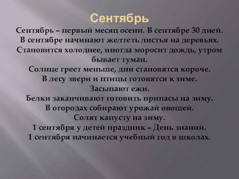 Сентябрь – первый месяц осени. В сентябре 30 дней.