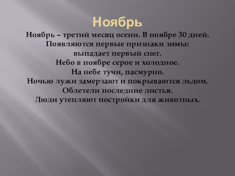 Ноябрь – третий месяц осени. В ноябре 30 дней.