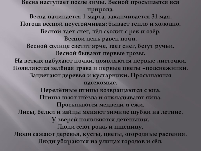 Весна наступает после зимы. Весной просыпается вся природа.