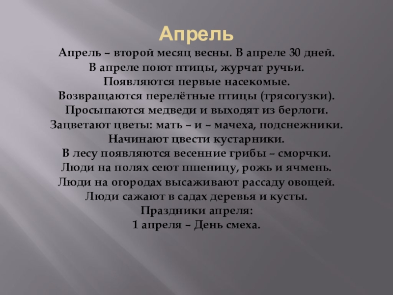 Апрель – второй месяц весны. В апреле 30 дней.