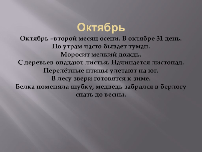 Октябрь –второй месяц осени. В октябре 31 день.