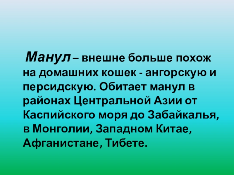 и персидскую. Обитает манул в районах Центральной Азии от Каспийского моря до Забайкалья, в Монголии, Западном Китае, Афганистане, Тибете.
