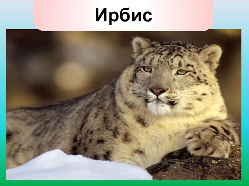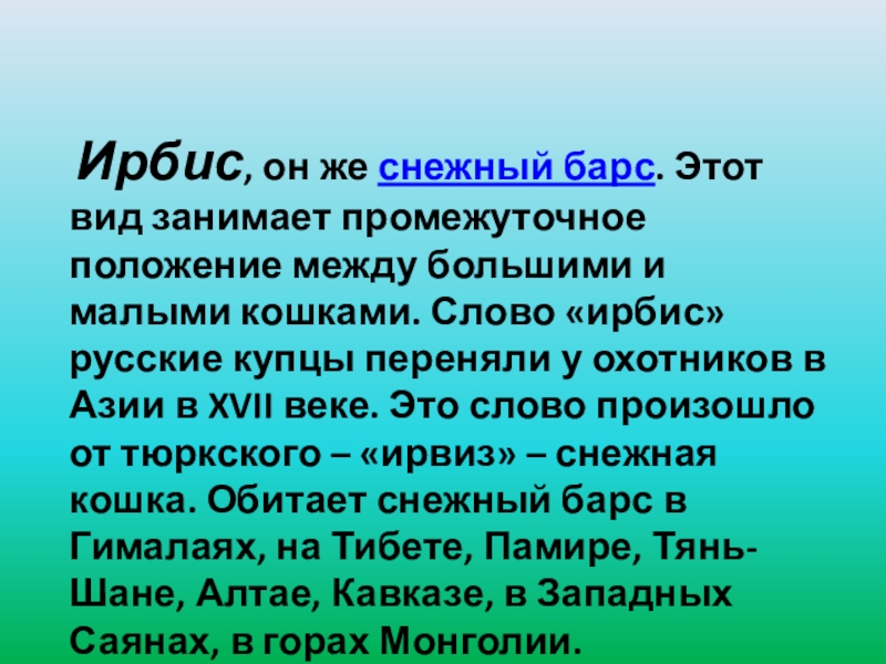 положение между большими и малыми кошками. Слово «ирбис» русские купцы переняли у охотников в Азии в XVII веке. Это слово произошло от тюркского – «ирвиз» – снежная кошка. Обитает снежный барс в Гималаях, на Тибете, Памире, Тянь-Шане, Алтае, Кавказе, в Западных Саянах, в горах Монголии.