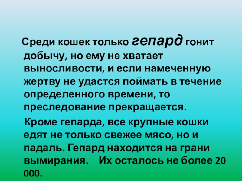 Кроме гепарда, все крупные кошки едят не только свежее мясо, но и падаль. Гепард находится на грани вымирания. Их осталось не более 20 000.