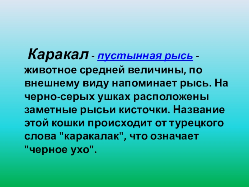 по внешнему виду напоминает рысь. На черно-серых ушках расположены заметные рысьи кисточки. Название этой кошки происходит от турецкого слова "каракалак", что означает "черное ухо".