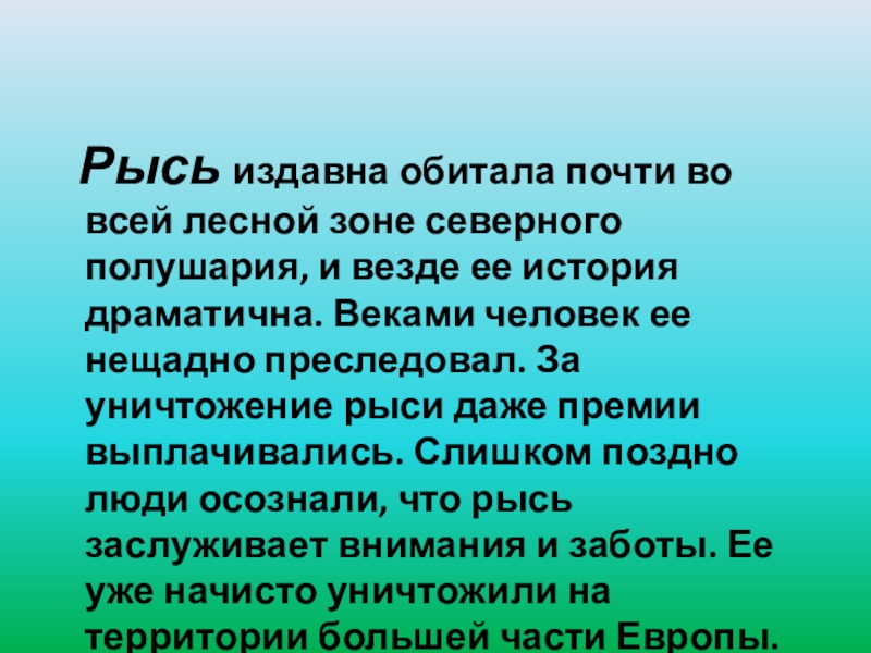 полушария, и везде ее история драматична. Веками человек ее нещадно преследовал. За уничтожение рыси даже премии выплачивались. Слишком поздно люди осознали, что рысь заслуживает внимания и заботы. Ее уже начисто уничтожили на территории большей части Европы.