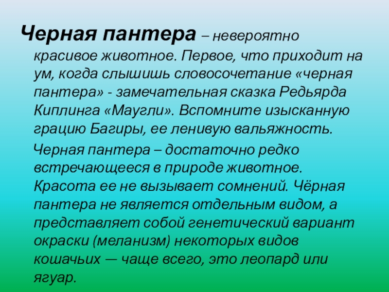 когда слышишь словосочетание «черная пантера» - замечательная сказка Редьярда Киплинга «Маугли». Вспомните изысканную грацию Багиры, ее ленивую вальяжность.