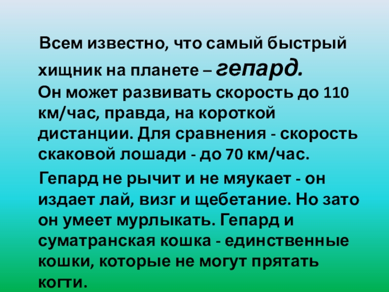 Гепард не рычит и не мяукает - он издает лай, визг и щебетание. Но зато он умеет мурлыкать. Гепард и суматранская кошка - единственные кошки, которые не могут прятать когти.